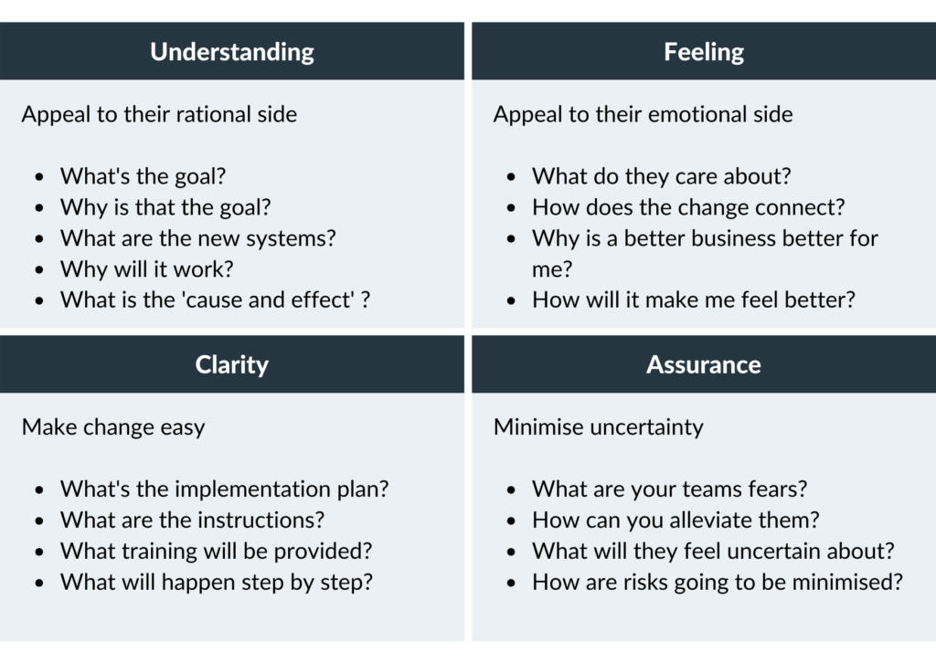 When implementing change; people don’t fear change, they fear uncertainty. Uncertainty around failure, around expectations, around belonging. For your intended changes, it’s important to prepare and address these uncertainties head on.